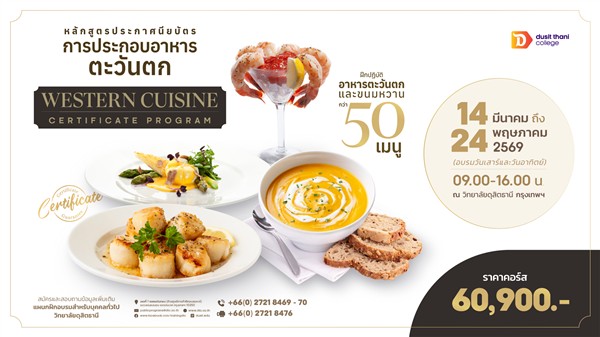 หลักสูตรฝึกอบรม “การประกอบอาหารตะวันตก” อบรมระหว่างวันที่ 14 มีนาคม – 24 พฤษภาคม 2569 (อบรมเฉพาะวันเสาร์และอาทิตย์) เวลา 09.00 – 16.00 น. ณ วิทยาลัยดุสิตธานี กรุงเทพฯ เป็นการอบรมจำนวน 120 ชั่วโมง 20 วัน ค่าใช้จ่ายในการเข้าร่วมอบรมท่านละ 60,900 บาท